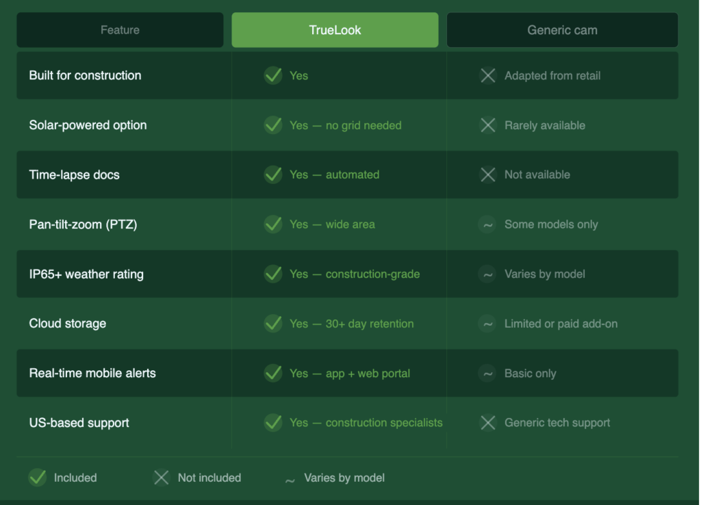 Most AI surveillance tools on the market are adapted from commercial or retail security use cases and retrofitted for construction. TrueLook cameras are designed from the ground up for construction jobsites, which creates meaningful differences in real-world performance.
