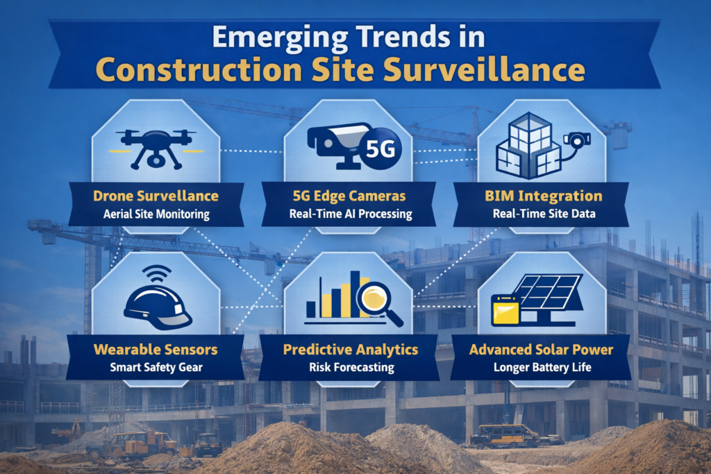 The most significant emerging trends in construction site surveillance are the convergence of AI video analytics with drone-based aerial surveillance, the expansion of 5G-connected edge-computing cameras, and the integration of surveillance data with Building Information Modeling (BIM) platforms for real-time site intelligence. These advances are moving construction surveillance from a reactive security tool to a proactive site management system.