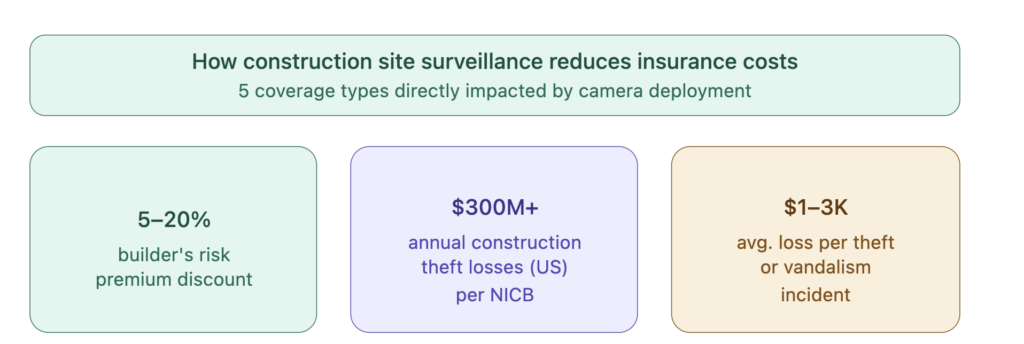 Many construction insurance carriers offer premium discounts of 5–20% for verified, centrally monitored surveillance systems — meaning the system can partially pay for itself through reduced coverage costs.